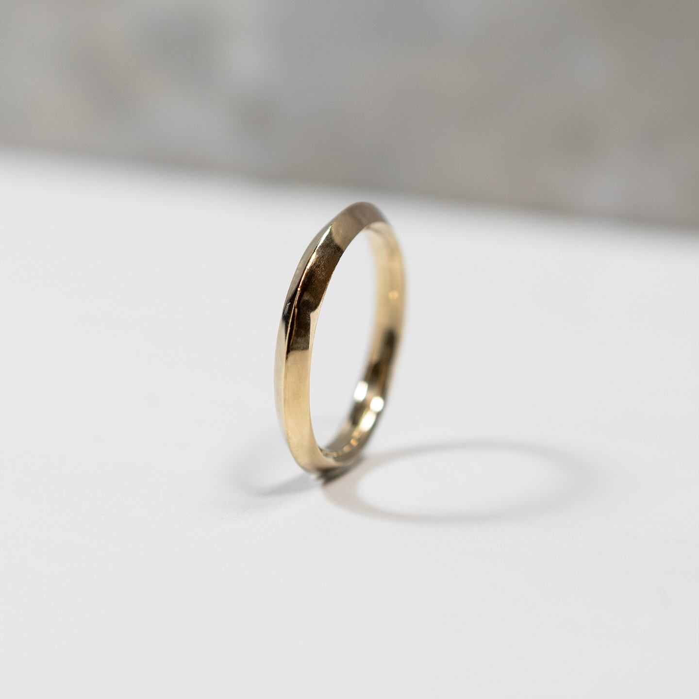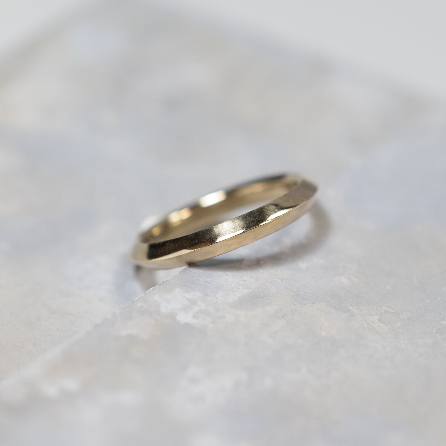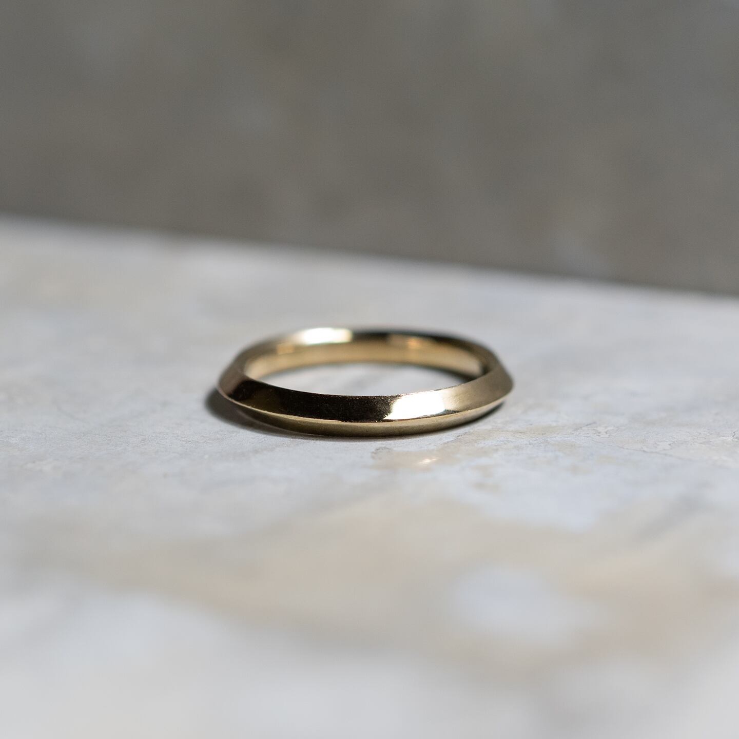 リング全体に施された滑らかな鏡面仕上げは光を美しく反射させ、仕上げに施したゴールドのメッキコーティングは柔らかく上品な色味で肌馴染みが良く、すっきりと削ぎ落とされた三角のフォルムのデザインと素材感を最大限に引き立てます。