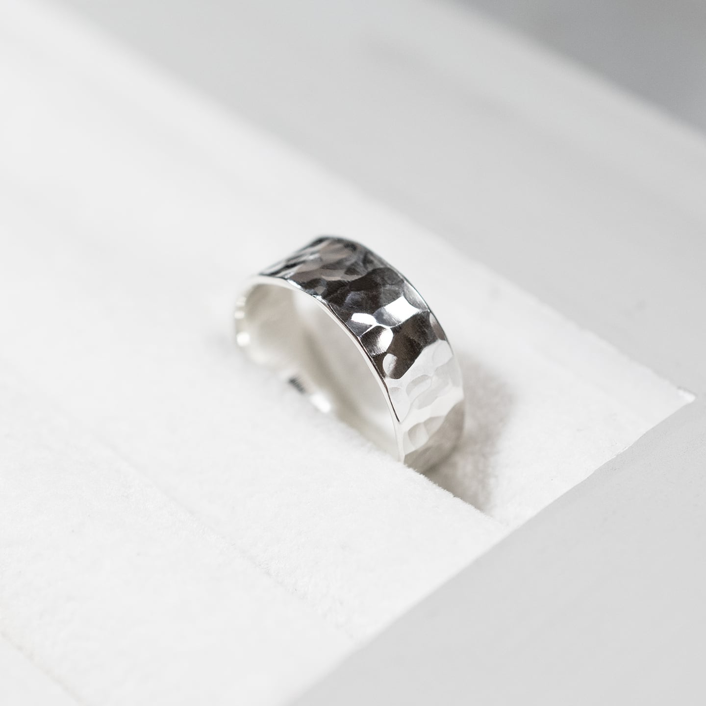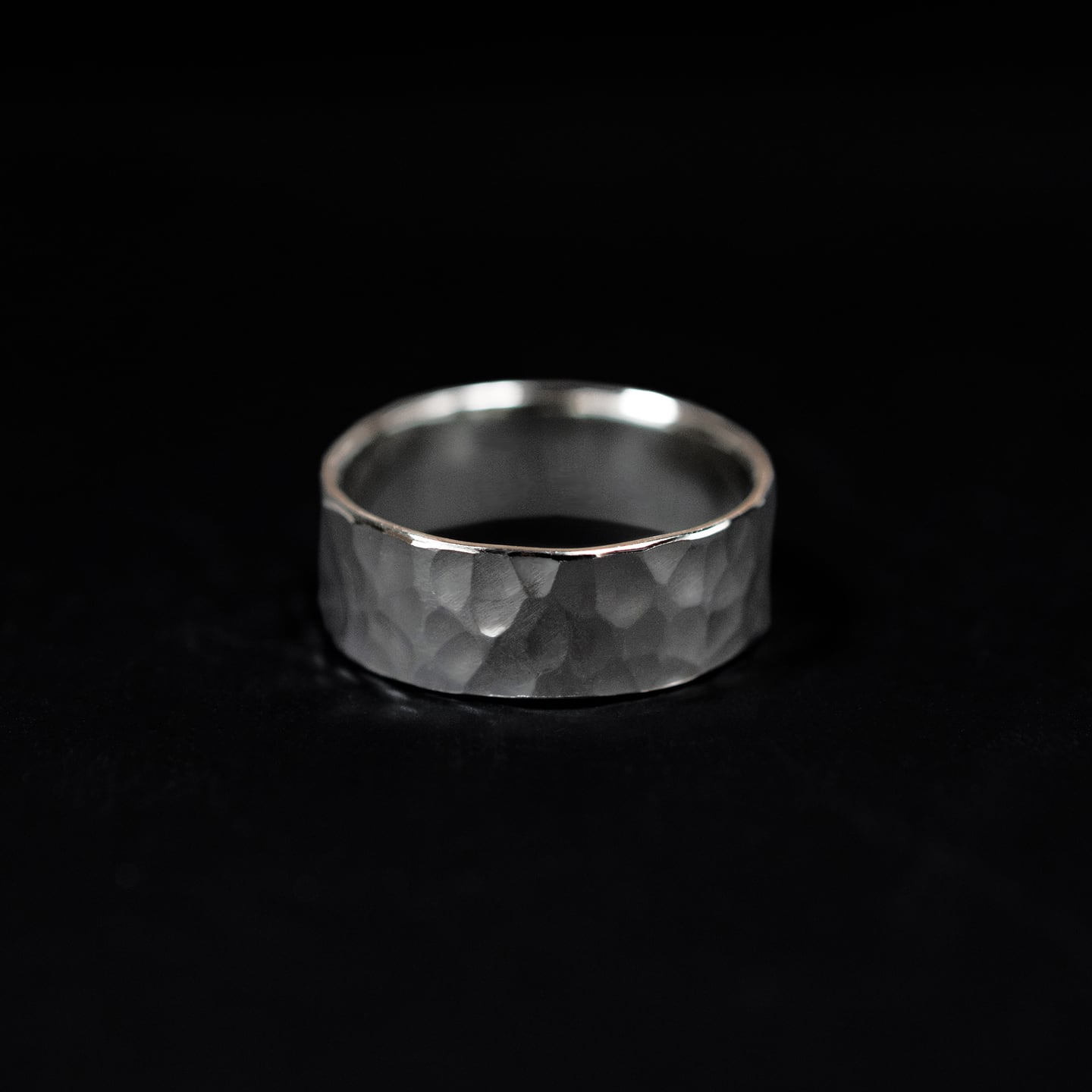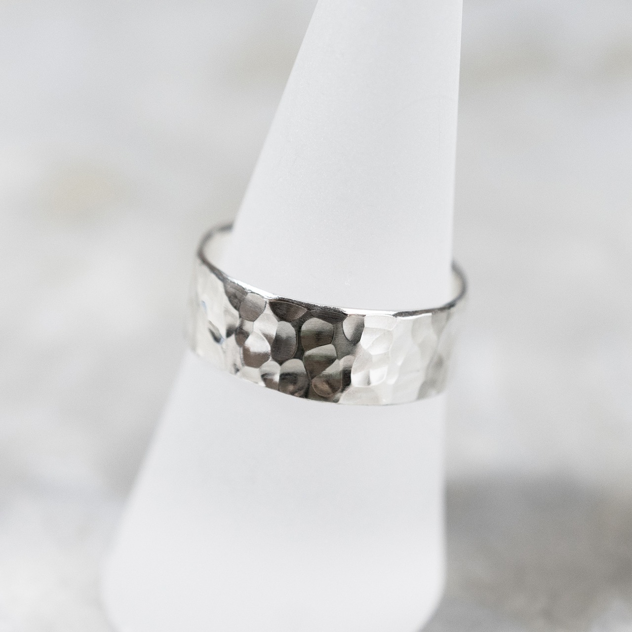 ランダムな槌目模様が印象的、シルバーで作られたスタンダードなデザインの平打ちリング。