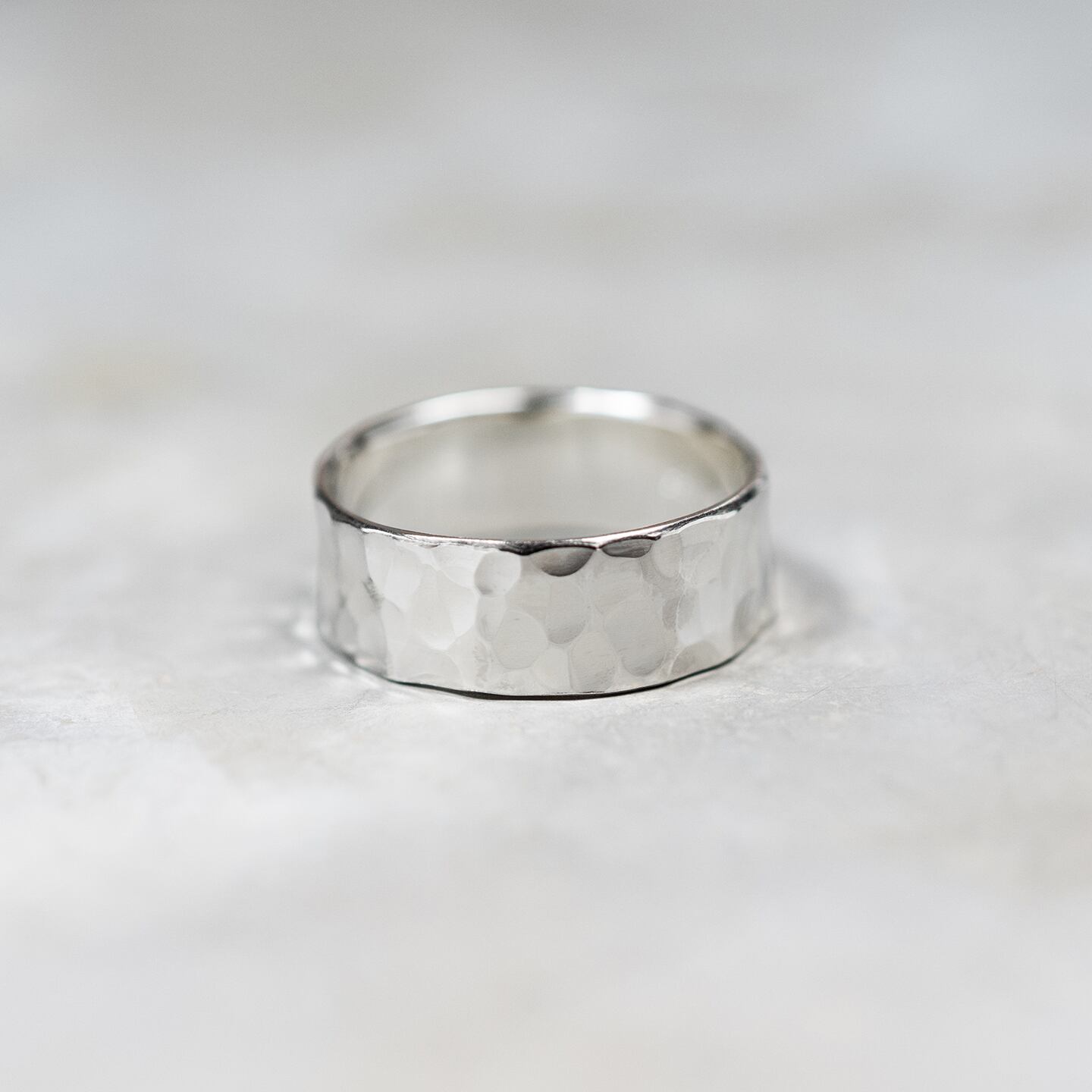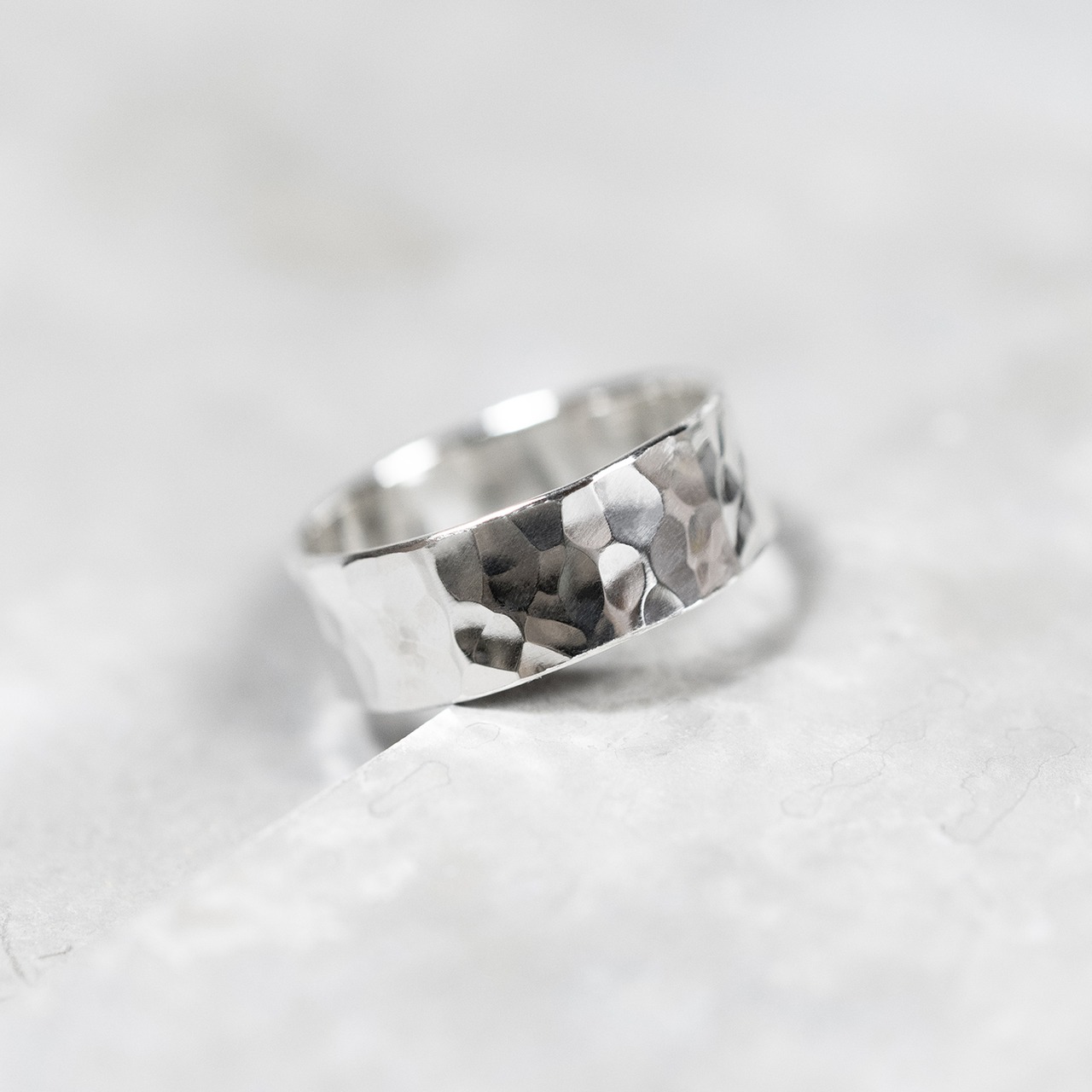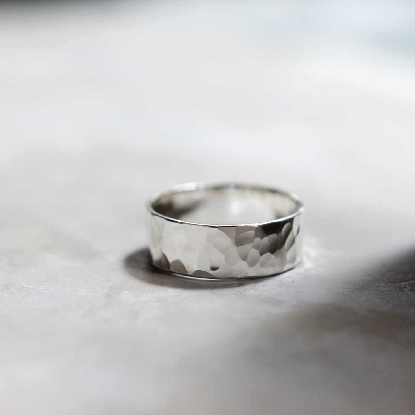 ランダムな槌目模様が印象的、シルバーで作られたスタンダードなデザインの平打ちリング。