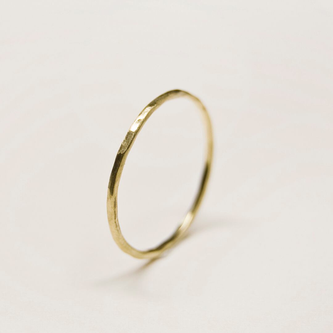 シンプルな定番デザインのリングで、不均一な凸凹感が特徴の槌目加工を施し、落ち着いた質感のマット加工(つや消し)で仕上げています。華奢な作りなので、シーン問わずジャンルレスに対応できる万能アイテムです。重ね付けをしても馴染みやすいので、コーディネートに取り入れやすい一品です。使い込むと時間の経過と共にゴールドカラーからヴィンテージ感が増し、真鍮特有のアンティークな雰囲気に変化していきます。サイズ(号数)を幅広く展開をしておりますので、ユニセックスアイテムとしてメンズ・レディース問わずお使い頂けます。