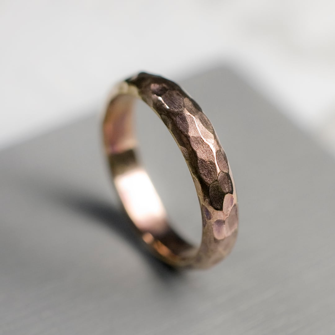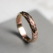 丸みを帯びた柔らかいフォルムが印象的で、程良いボリューム感が指元にアクセントをプラスしてくれます。不均一な凸凹感が特徴の槌目模様をリング全体に打ち込み、仕上げにピンクゴールドのメッキコーティングを施しています。ベーシックなデザインなのでシーンを選ばず幅広いスタイリングに取り入れやすく、お手持ちのリングとの重ね付けにもお使い頂けます。サイズ(号数)を幅広く展開しておりメンズ・レディース問わずユニセックスでお選び頂けますので、ペアリングとしてご着用頂くこともお勧めです。
