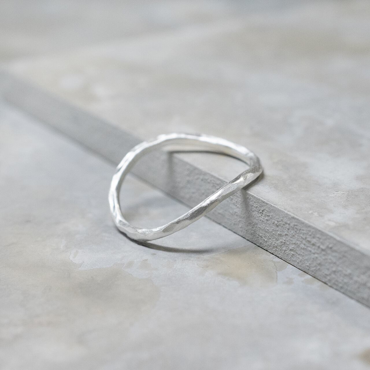 1.5mm幅の細めな作りで、柔らかいウェーブが入ることでアクセントが加えられ、シンプルながら動きのあるフォルムを作り込んでいます。着用すると見る角度や位置によって異なる曲線の表情が現れます。